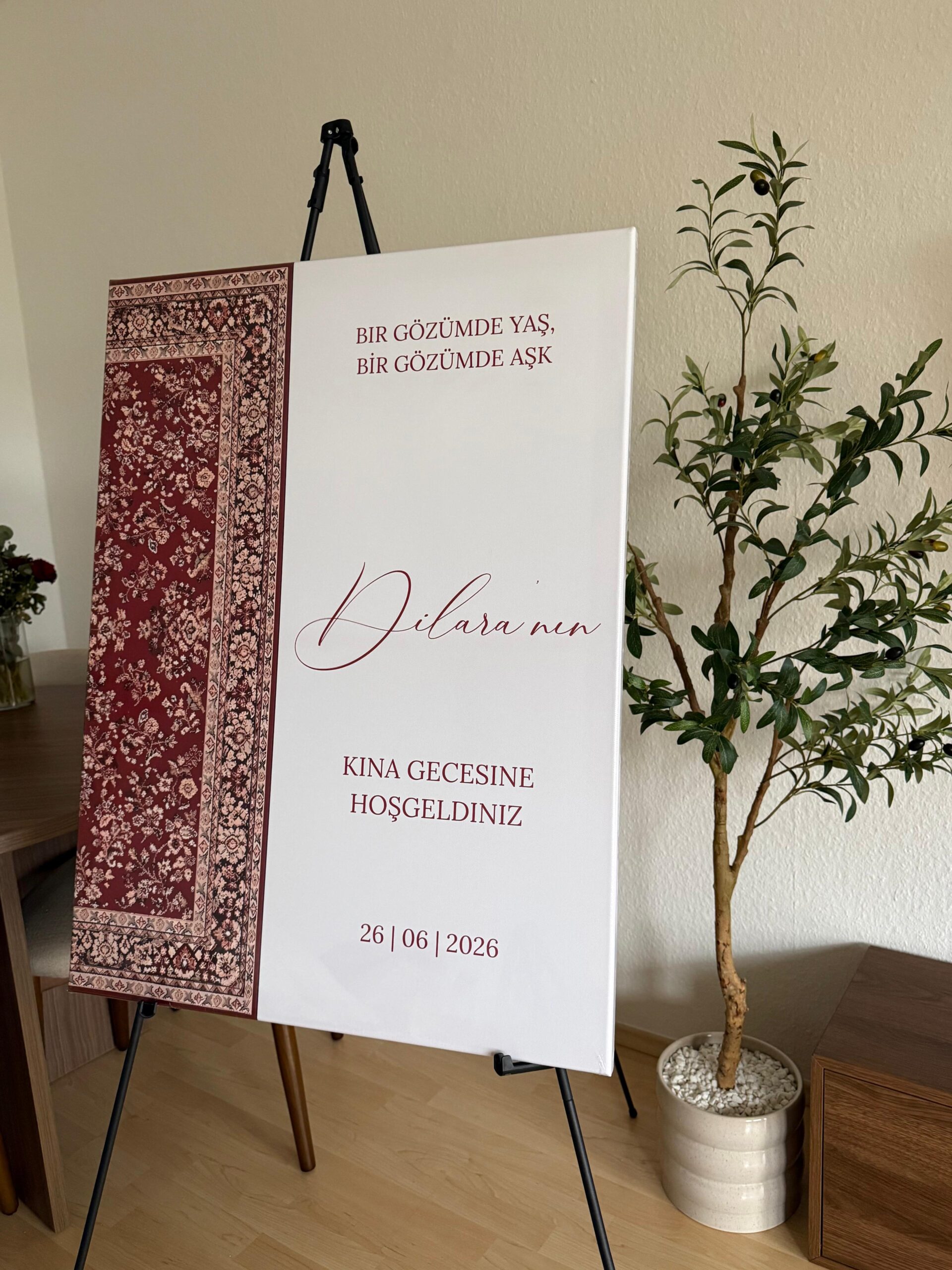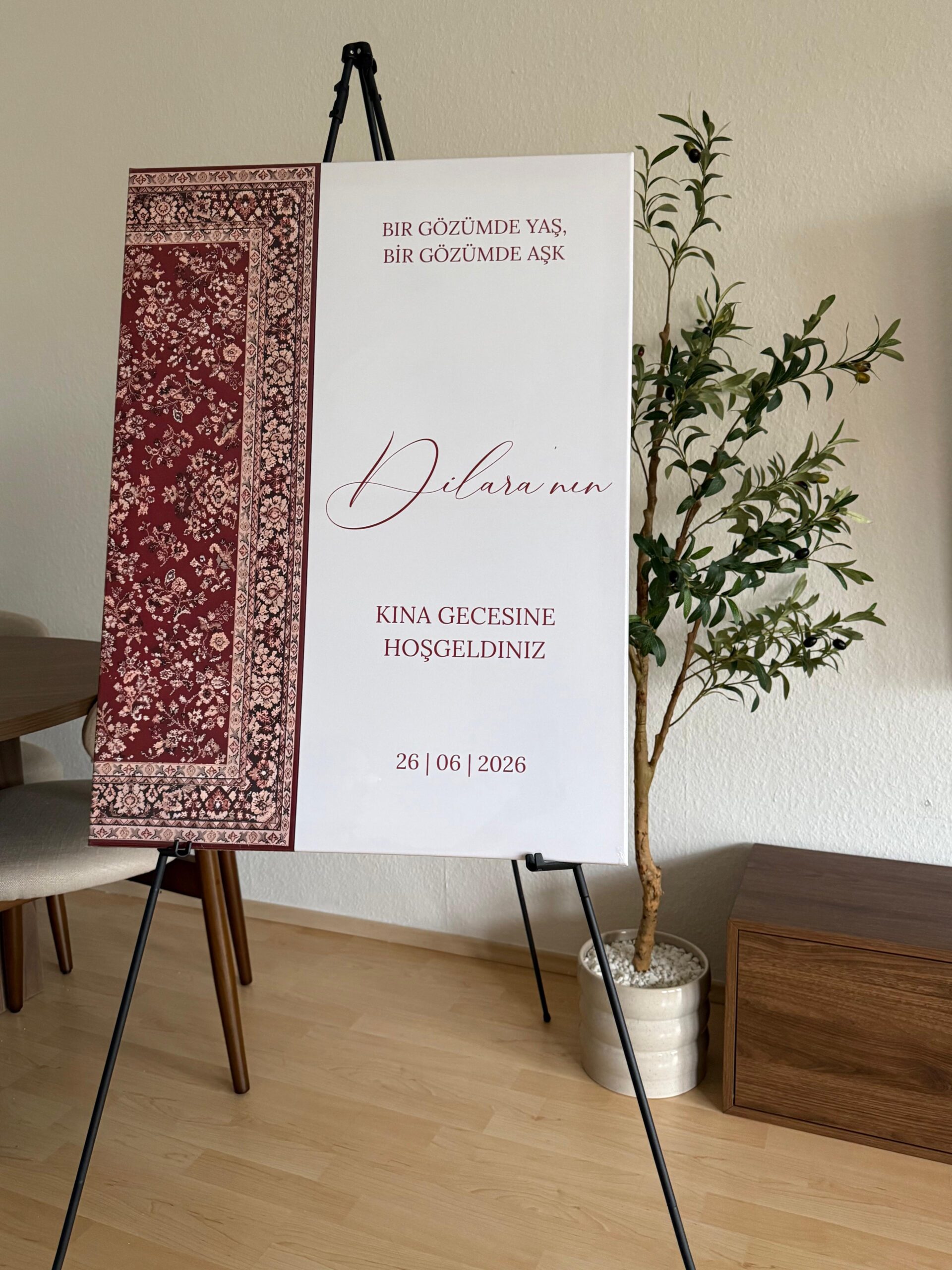 Ob Kına Gecesi, Henna-Abend, Nikah, Nişan, Söz, Standesamt oder Hochzeit – diese personalisierte Empfangstafel Hochzeit verleiht deinem Event eine besondere Atmosphäre und verbindet Tradition mit modernem Design.